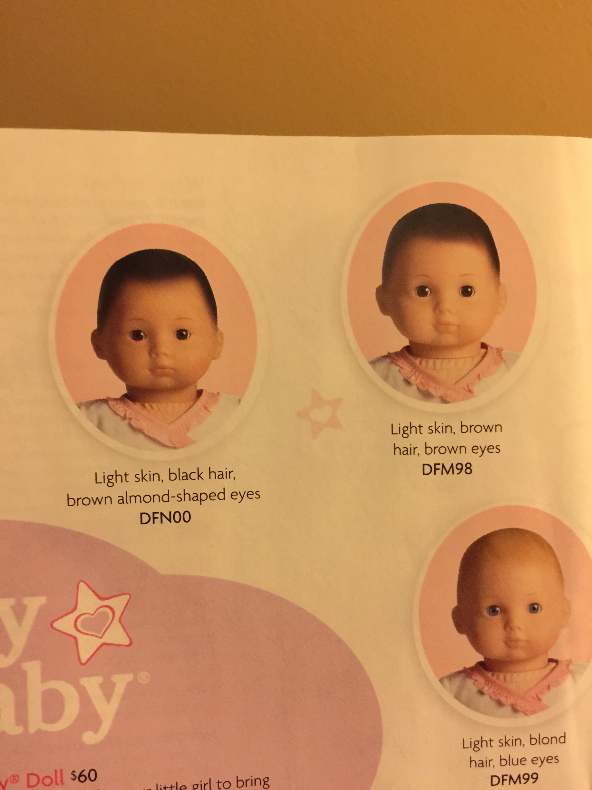 Racially or ethnically specific baby dolls from the company that makes the American Girl line of toys–apparently very popular, at least based on the lines that form in front of the midtown storefront (in Manhattan) during special events. (My 3 year old daughter seems to like these dolls a lot too.) I get why the American Girl company made these baby dolls, and I get why some kids and their parents prefer them over the “traditional” American girl doll (traditional meaning white). In other words, it makes sense for a little kid to have a doll that looks like her. But there’s the rub. Do these dolls look like an Asian American kid or a Latina child? The doll on the top left is suppose to appeal to Asian American girls–note the “almond eyes” description. My daughter has that one. When I first saw the actual doll, my initial reaction was, okay, maybe it looks Asian. But then when I saw the picture of the doll next to the Latina doll (see the picture top right), I began to wonder what the American Girl company is trying to do with these dolls.